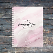 Le journal contient 98 pages et est de format 8.5X11 pouces. Il est relié avec des anneaux métalliques noirs. Les couverts avant et arrière sont laminés avec un fini anti-graffignes pour vous offrir un produit durable, qui restera beau avec le temps.